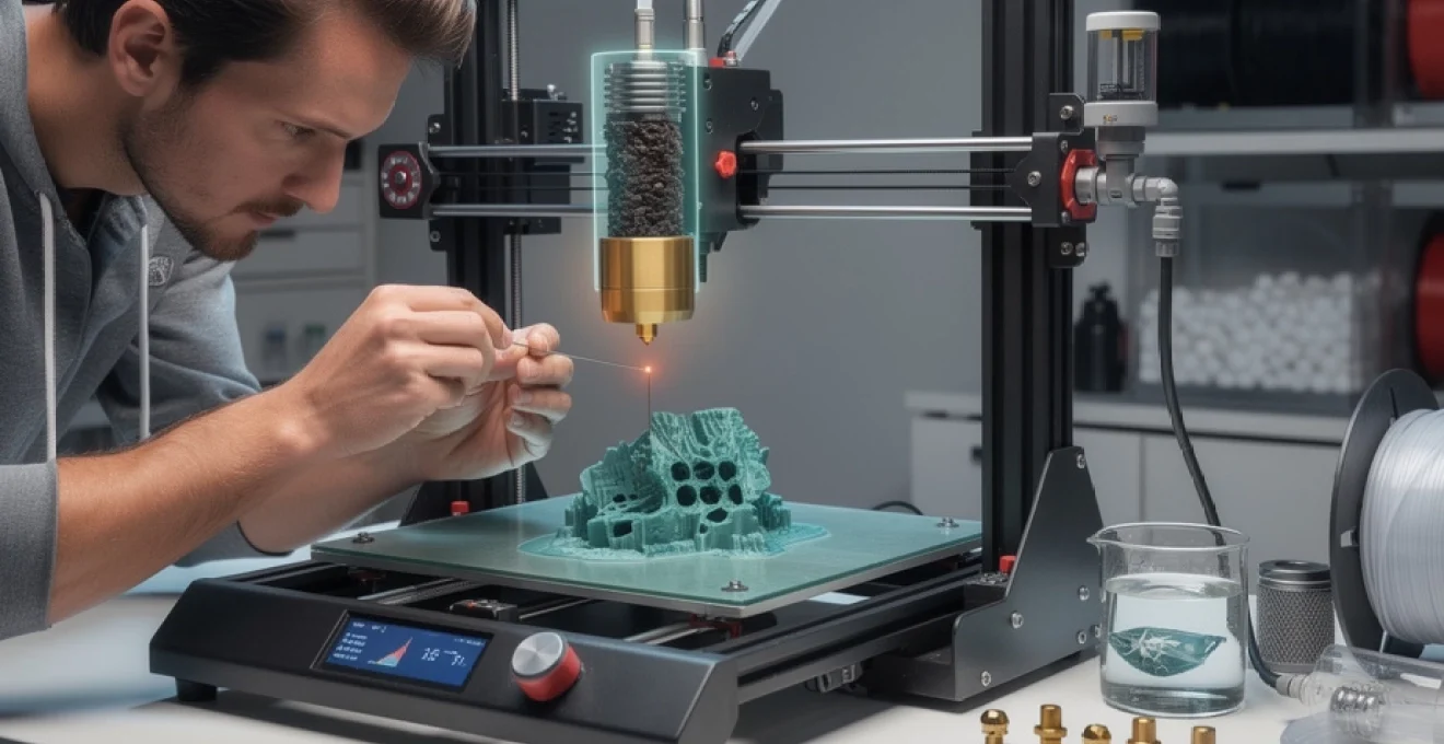 De plus, chaque matériau possède une plage de température optimale. Imprimer un filament chargé bois à 190 °C, quand le fabricant recommande 210–220 °C, revient à tenter de faire passer un liquide visqueux à travers un goulot étroit : la pression augmente, le flux devient irrégulier, puis les particules se compactent à la sortie. Pour les matériaux composites, privilégiez des buses en acier trempé ou en ruby, augmentez légèrement la température dans la limite indiquée, et utilisez un diamètre de buse d’au moins 0,6 mm pour limiter les obstructions.