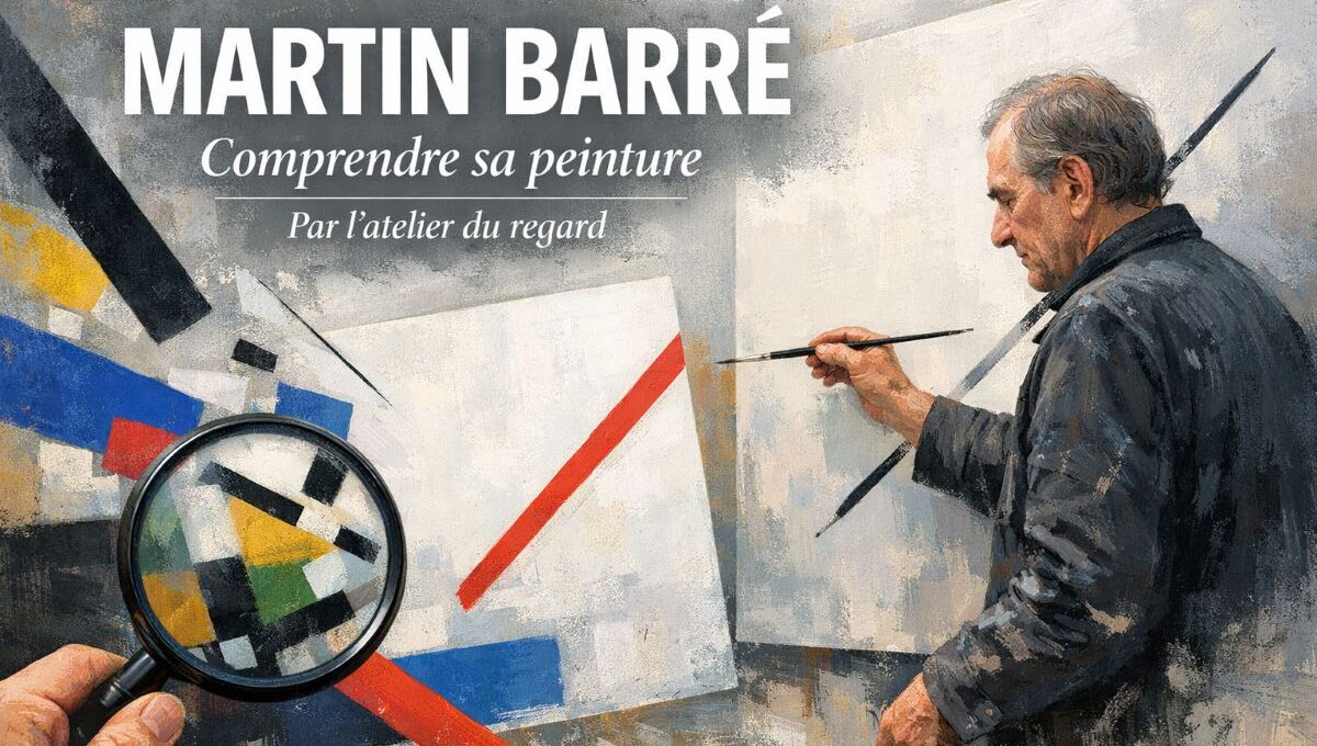 Devant une peinture de Martin Barré (1924–1993), la réaction la plus honnête tient souvent en une phrase : “c’est simple… mais je sens que ça m’échappe”. C’est précisément là que son travail commence. Barré ne cherche pas à séduire par l’effet. Il place le regard face à une décision minimale — une ligne, une oblique, une bande, une trace noire — et il vous oblige à mesurer ce que cette décision fait au champ, au silence, à l’espace. Cette page n’est donc pas une biographie déguisée : c’est un mode d’emploi sensible, structuré comme un atelier, avec des tests, des outils, et des repères concrets pour voir mieux.
